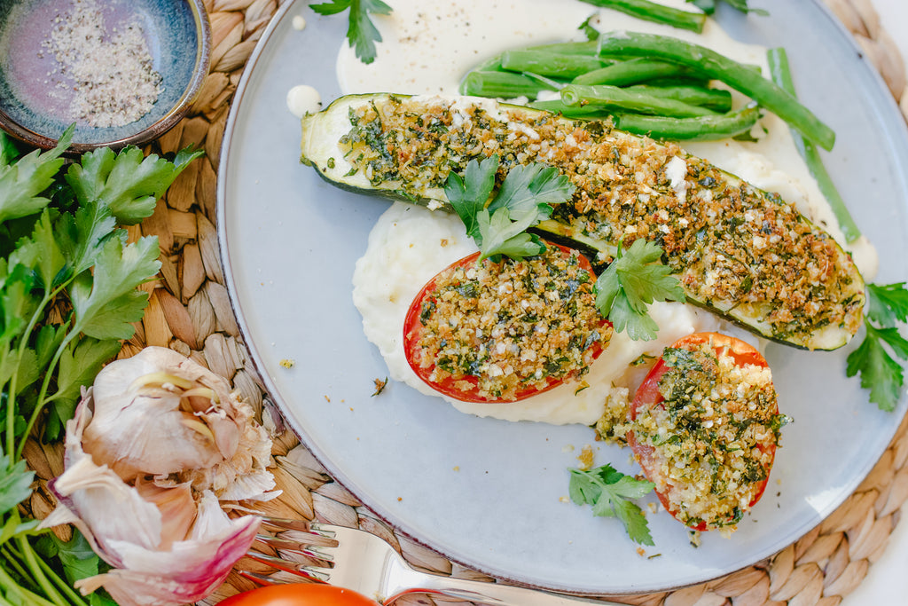 Roasted Crumbed Tomatoes, Zucchinis, Mash & Mustard Cream