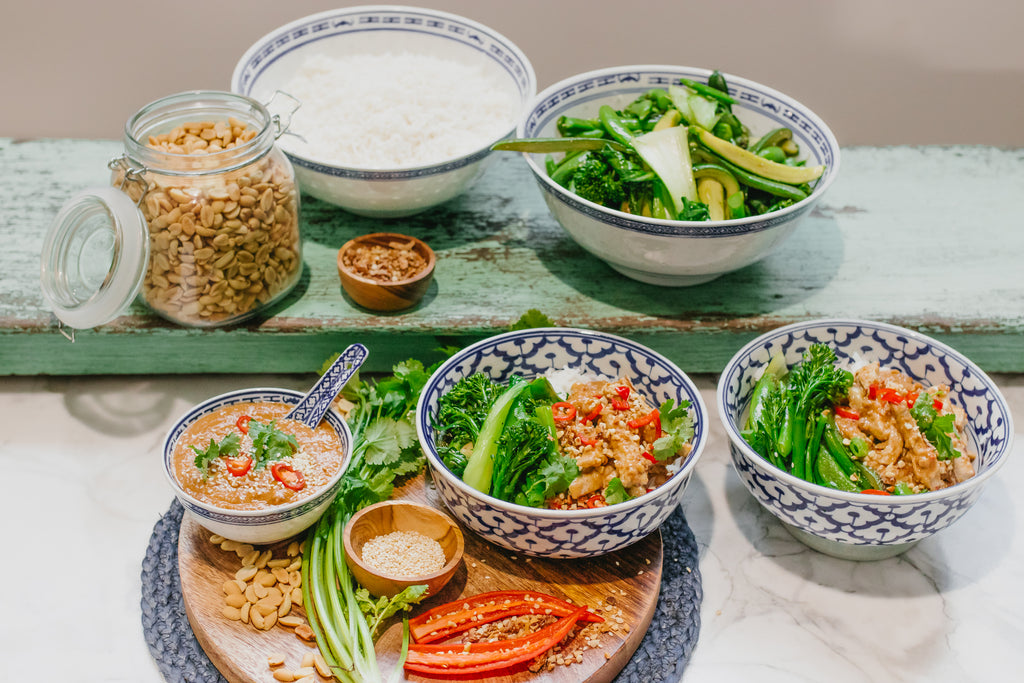 Satay Tofu, Green Vegetable & Rice Bowl